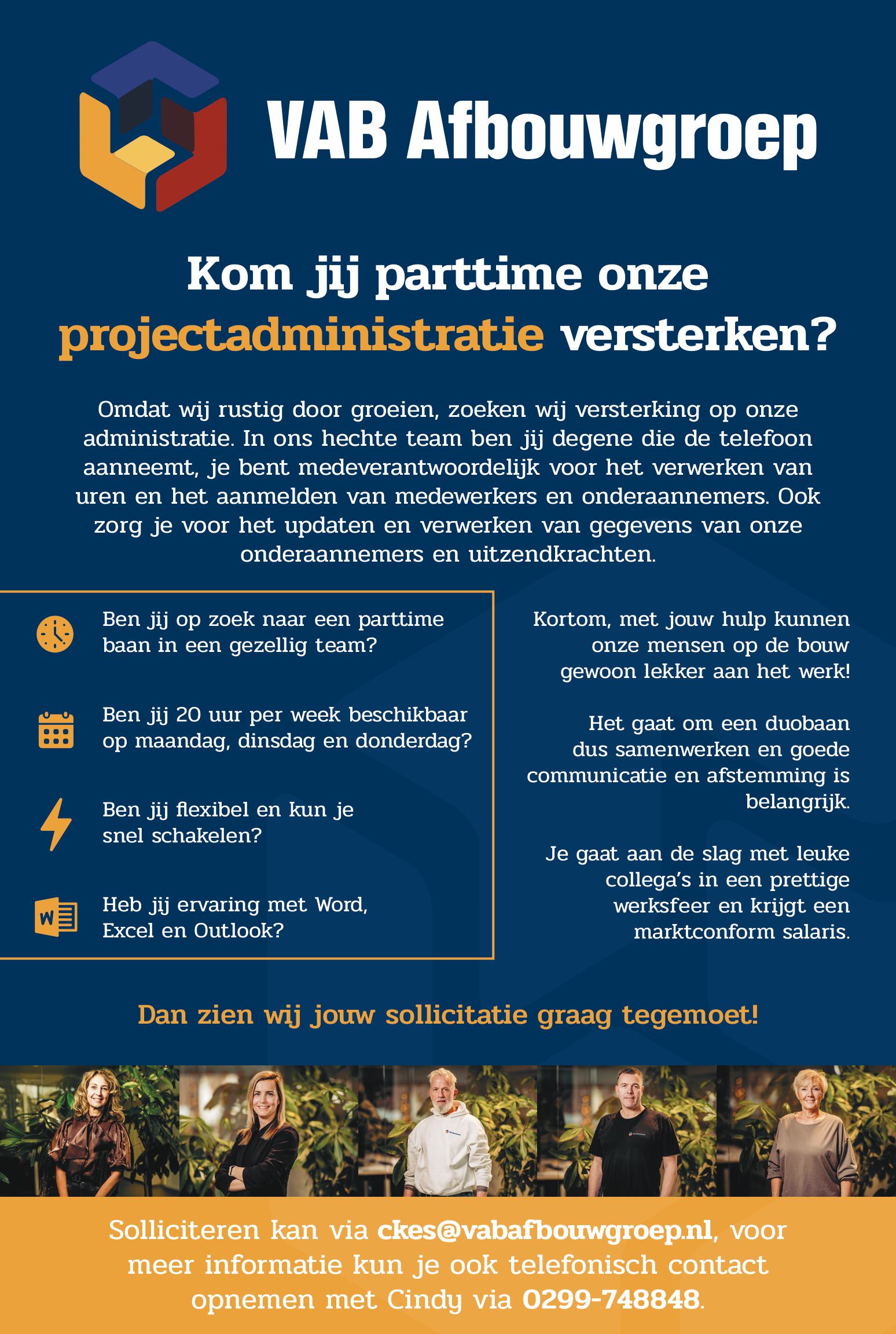 Omdat wij rustig door groeien, zoeken wij versterking op onze administratie. In ons hechte team ben jij degene die de telefoon aanneemt, je bent medeverantwoordelijk voor het verwerken van uren en het aanmelden van medewerkers en onderaannemers.