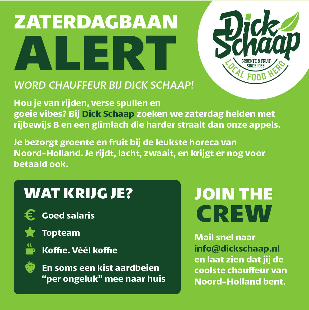 Bij Dick Schaap zoeken we zaterdag helden met rijbewijs B en een glimlach die harder straalt dan onze appels.